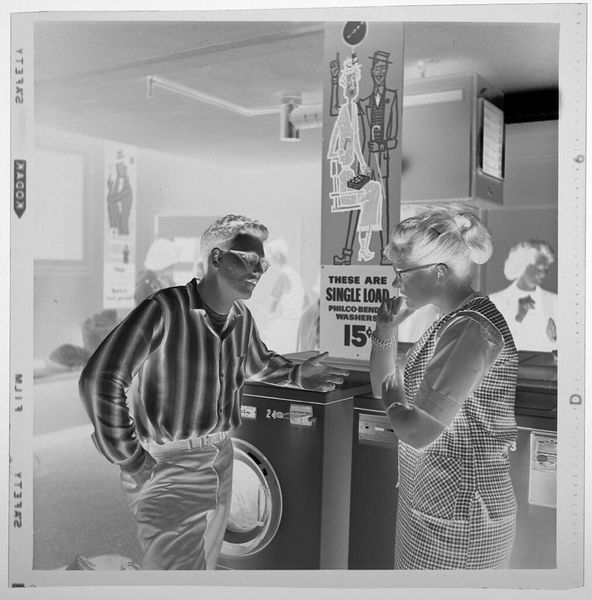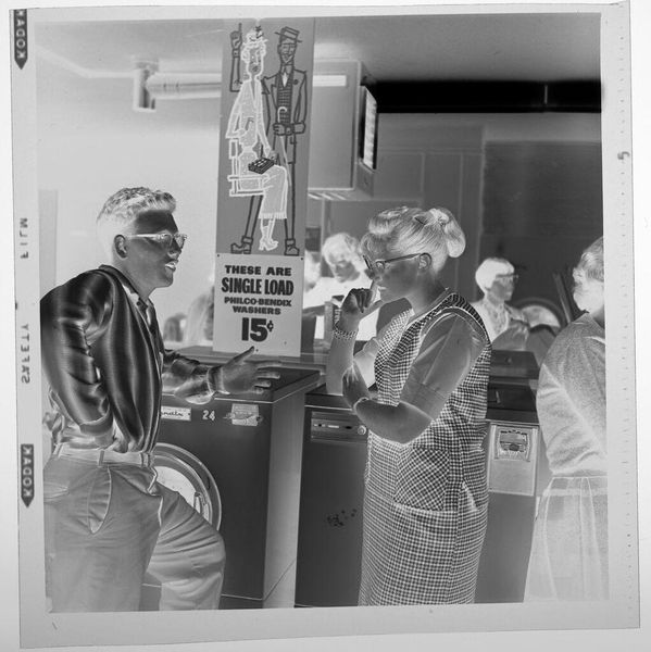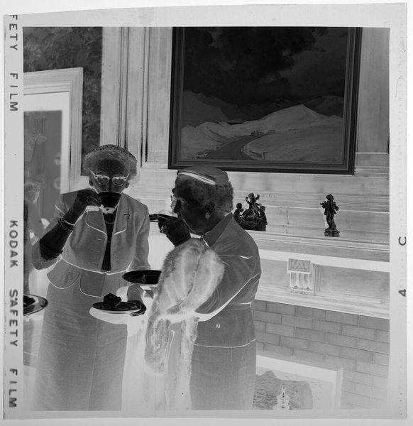 Curator: This is an untitled photograph by Jack Gould, part of our collection here at the Harvard Art Museums. It captures children buying snacks, likely at a movie theater concession stand. Editor: The high contrast lends a stark, almost unsettling mood to a seemingly mundane scene. It's like a memory filtered through time. Curator: Consider how Gould uses the grain and tonality to subtly emphasize the textures of everyday life—the popcorn machine, the children's clothing, the layered signage. These details construct a complex visual syntax. Editor: Yes, and I'm thinking about the means of production. What type of film was used, and how did it inform the image’s aesthetic? What was the labor involved in running this local movie house? The concessions? Curator: Excellent points. The composition, however, forces our focus on the interplay between light and shadow, ultimately creating a powerful commentary on temporality and presence. Editor: Still, this image makes me think of the history of labor in the film industry, from the actors on screen to the unseen workers behind the scenes providing the snacks. Curator: Indeed, a photograph so unassuming reveals layers of depth. Editor: It is a potent reminder of the materiality behind even the most fleeting pleasures.