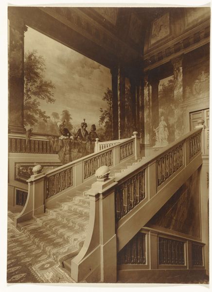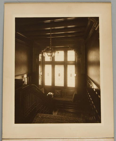 Editor: This photograph, by Floride Green, captures the sitting room of the Telegraph Hill Neighborhood Association in San Francisco. There is such a strong emphasis on the use of horizontal and vertical lines. What strikes you most about the formal qualities of this composition? Curator: The photograph’s structure hinges on the interplay between interior and exterior space, mediated by the strong geometry of the door frame. Notice how the light outside creates a sharp contrast with the dark interior, almost flattening the image. Editor: I see what you mean. The contrast does make it appear very two-dimensional. What about the arrangement of objects? Do you think that communicates a message? Curator: Observe the repetition of rectangular forms—the ceiling panels, the door's glass panes, the books. This repetition creates a sense of order and containment, perhaps reflecting the settlement house's intended function of bringing structure to the community. Does that resonate with you? Editor: Yes, the order is definitely there. I hadn't considered how that might relate to the settlement house's purpose. Thank you! Curator: It is in considering the interplay of formal elements such as these that we can find deeper resonance in the artwork.