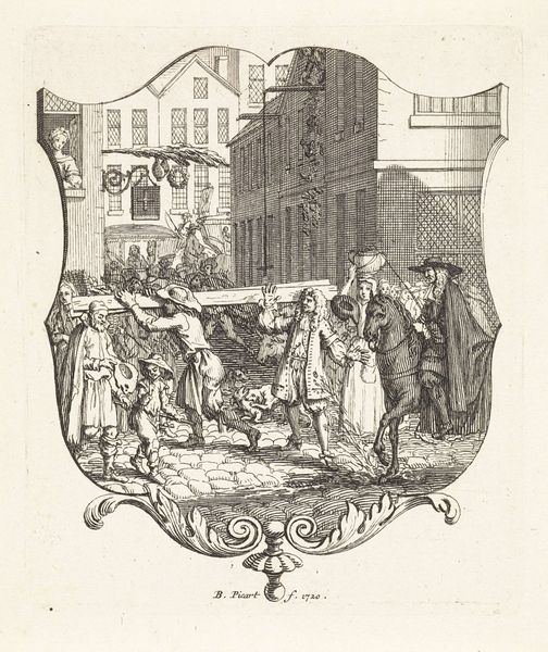 This is Johannes Hilverdink’s lithograph "Plein met verscheidene figuren," made in 1842. Its monochrome palette, articulated by a range of greys, sets a stage for the drama unfolding. Note how the artist frames the scene with a theatrical curtain, immediately drawing us into its constructed reality. The composition is meticulously arranged, creating a hierarchy of gazes. The architecture looms, an ordered grid of windows and stone, while the figures below are a bustling collection of shapes and forms. Hilverdink toys with perspective, creating a stage-like space where the players perform for the viewer. The figures, though small, are rendered with enough detail to suggest their individual stories. The chickens at the front add a touch of the everyday, grounding the scene in a tangible reality. Look closely at the building, in the way it is structured, providing a backdrop that contains and defines the human activity. This interplay between order and spontaneity invites us to ponder the relationship between the individual and the collective, and how the built environment shapes our experience.