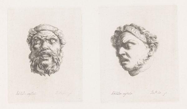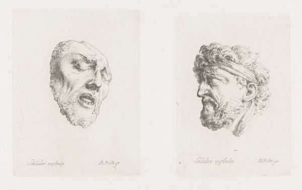 Editor: Here we have Christian Bernhard Rode's "Old and Young Dead Warrior," an engraving from 1759, here at the Rijksmuseum. The figures look as if they have been mounted as trophies or emblems. What story do you think this image is trying to tell us? Curator: Well, aren’t we all just trying to figure out our place amidst the echoes of the past? This piece, it feels like a quiet reflection on mortality, wouldn't you agree? Rode captured the brutal, yet somewhat romantic, essence of the Baroque period. Editor: The engraving really accentuates that almost theatrical contrast of youth and experience, doesn’t it? But how would it fit in "history-painting"? Is it less a snapshot and more an emblem of conflict? Curator: Absolutely, but it invites a different reading too: it reminds us of life’s cyclical nature, right? It speaks volumes about duty, sacrifice, and the inevitable march of time. Don’t you think? Editor: I see what you mean; that eternal cycle of glory and defeat. But the youth has the higher "ground" – does it say anything specific? Curator: I don't know if I see it that way - but Rode's own history makes you think... did personal experiences bleed into this narrative? You know, moments when his youthful zeal was confronted by the stoicism of age... Perhaps Rode’s playing with time, not ground? What would you say? Editor: Hmmm... It makes me want to dig deeper into the artist’s life and other works – thanks! Curator: My pleasure; now, off you go to unravel more of art's fascinating tales. Farewell!