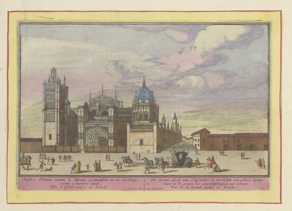 Curator: Here we have Pieter van den Berge's "View of the Stock Exchange in Seville," created sometime between 1694 and 1737. It's a composite piece, using watercolor, engraving, and etching to depict the bustling commercial heart of the city. What strikes you first? Editor: The almost obsessive rendering of texture. Look at the stone facade of the buildings, the layers upon layers – you can practically feel the labor and the physical act of repetitive making. It feels both precise and incredibly detailed. Curator: Absolutely. Consider Seville during this period. As a key port in Spain’s colonial trade, the Stock Exchange was not merely a place of commerce; it symbolized Spain's power and wealth acquired through the exploitation of labor and resources in the Americas. The grandeur and scale of the building, so meticulously captured, are reflective of this historical context. Editor: And that etching! Notice how the artist meticulously captures the texture and the interplay of light and shadow, highlighting the architecture. The drawing captures how class distinctions become manifest in architectural and urban design. The building almost becomes a monument of that social hierarchy through these details of materials. Curator: Exactly. You see how Van den Berge uses perspective and scale to emphasize the importance of the Exchange within the cityscape. The figures are purposefully diminutive, placed in contrast to the massive building to underscore its imposing authority. Editor: The human figures give context. Van den Berge is representing a vibrant economy fueled by exploitation across an international mercantile web, revealing how such seemingly abstract systems of exchange were tied to the movement and transformation of raw materials and goods through complex global markets. The entire scene becomes a landscape of material extraction and distribution. Curator: Considering that lens enriches our appreciation. Van den Berge’s seemingly straightforward cityscape drawing becomes a powerful commentary on the socio-political forces at play during that era. Editor: Agreed. Looking at the ways these materials shape perception offers a stark view of a society built upon economic stratification. A drawing may reveal such historical details about mercantile capitalism if we look for its texture.