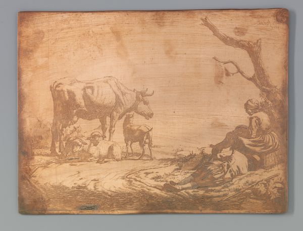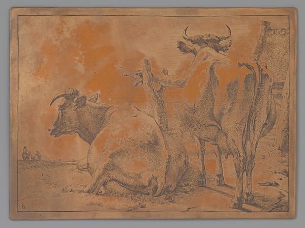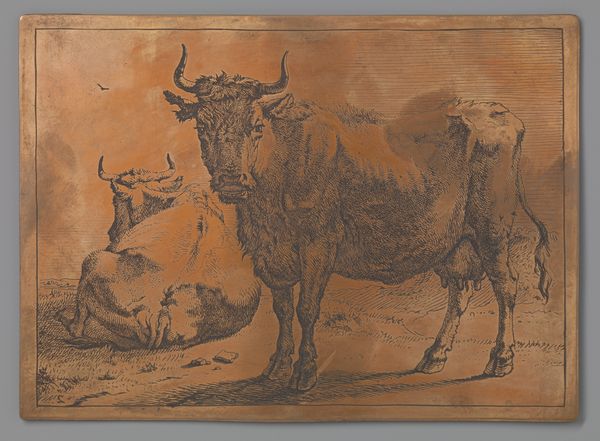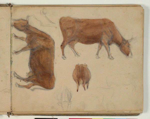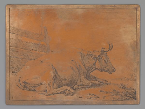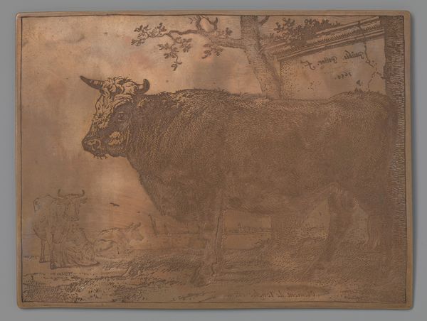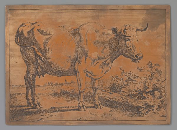 Curator: Paulus Potter's "Grazende Koe," or "Grazing Cow," created around 1650, offers a striking portrayal of pastoral life in the Dutch Golden Age. The work is ink on paper. Editor: My first thought is how massive the foreground cow feels. It’s almost bursting out of the frame with such presence and weight. The muted earth tones contribute to this feeling of grounded solidity. Curator: Potter’s cows weren't merely cows; they reflected the Netherlands’ burgeoning national identity and pride in its agricultural prowess. Land reclamation and husbandry were potent symbols. Think about the socio-economic implications here. Editor: Absolutely. The Dutch Golden Age wasn't just about trade; it was deeply intertwined with agricultural innovation. Could we view this intimate depiction of the cow as an emblem of national prosperity and an unspoken understanding of a society's relationship to food production, maybe even its food security? Curator: Precisely! The scale you noted plays a crucial role. By monumentalizing these creatures, Potter elevated the animal, symbolizing both Holland's rural economy and the importance of agriculture within the societal structure. Furthermore, he disrupts established hierarchy in art. Editor: The steeple visible in the background reminds me that society is not far off; nature and culture seem so tightly linked. The soft rendering, particularly in the animal’s fur and muscle definition, feels tender and insightful. But who would this artwork really have been intended for? Curator: Consider the burgeoning merchant class—these works affirmed their own elevated positions. Depictions of pastoral beauty suggested they, too, were now inheritors of Holland's 'Golden Age.' This, alongside their growing importance, meant a reshaped idea of class identity in Dutch society. Editor: This wasn’t simply documentation. This cow assumes an identity, and a symbol that reflects society's interwoven components. Thanks for offering some fascinating background for thought. Curator: Likewise; viewing Potter’s "Grazing Cow" through this lens offers a richer, socially informed experience of 17th-century Holland.