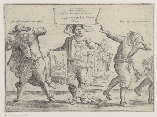Editor: Here we have "Man met een kijkkast" from 1793-1799, made with etching and colored pencil. It strikes me as odd – the figures are so exaggerated and cartoonish, it’s unsettling, yet playful. What do you make of the piece? Curator: Note the carefully constructed composition: The two figures, balanced on either side of the box, are masterfully positioned. Observe how the lines of their bodies – their noses, the curves of their stances – are mirrored and exaggerated to amplify the caricature. Do you see any internal rhyming here? Editor: Well, I noticed the repetition in their noses and how they lean forward similarly. But the 'internal rhyming', can you elaborate? Curator: Certainly. Consider the tension between the crisp, precise lines defining the figures, and the softer, blended hues of the coloured pencil washes. There is a deliberate discord that contributes to the overall sense of unease, a formal device which underpins and intensifies the work’s satirical nature. Editor: That makes sense, the contrast really heightens the comedic effect. And yet, it also contributes to that underlying sense of something not quite right. It is a perfect tension. Curator: Precisely. The beauty, or perhaps I should say the genius, of this piece lies in how these formal elements create layers of meaning. This engraver harnessed visual language to challenge societal norms. And that remains powerful today. Editor: That's fascinating. I hadn't considered how deeply the composition contributes to the message. I see the satirical quality much more clearly now. Curator: Yes, examining the formal devices unlocks layers of intention. The artist’s skillful manipulations guide our reading of the image.