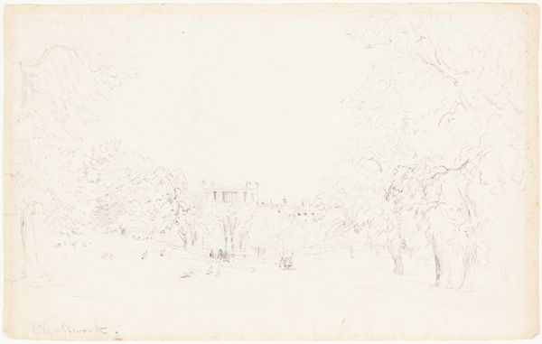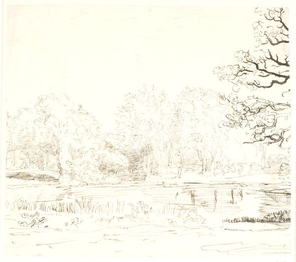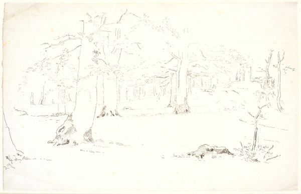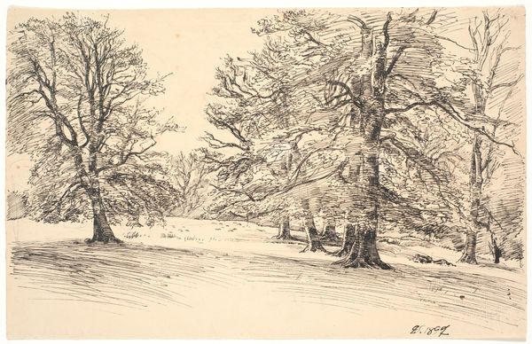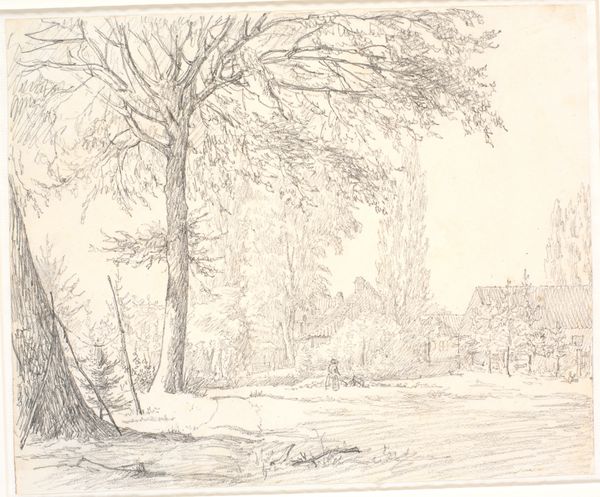 Curator: Looking at this artwork, titled "Landscape with Large Oak Trees, with Some Houses to the Left," dating from the 1840s, what are your first impressions? Editor: There's a sense of quiet isolation in the scene. The delicate ink work gives the landscape a dreamlike, almost ephemeral quality. Curator: The artist, Dankvart Dreyer, certainly captured a sense of Romantic longing for nature. But to delve deeper, the positioning of the large oak trees on the right acts as a frame that both obscures and protects those humble homes to the left, perhaps commenting on the shifting power dynamics of the era as the natural world becomes the subject of property. Editor: I think the trees function well, contrasting nature and habitation and offering insight into Romantic-era concerns, as well as anxieties over industrial progress and urbanization threatening rural communities. Curator: Consider the art market of the time. Etchings were increasingly available. They enabled a wider audience to consume images of nature, creating and reflecting a yearning for a simpler way of life amid complex socio-political shifts. Dreyer capitalizes on this. Editor: I appreciate that thought, particularly when discussing gender and the way Romantic landscapes sometimes excluded female figures from the narrative. It feels inherently patriarchal and creates distance. The etching itself—the way it almost withholds detail—contributes to a feeling of loss, of something receding from our grasp. Curator: Perhaps even a retreat into the natural world amid changing power dynamics within Danish society, creating, as you pointed out, distance to encourage reflection. Editor: Thank you. I feel like this etching invites viewers to grapple with ideas of identity and connection to place. It highlights these tensions as they reverberate within personal narratives and public discourse. Curator: Indeed. This small landscape speaks volumes, revealing both the beauty and the complex undercurrents of 19th-century Danish life.