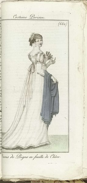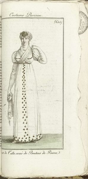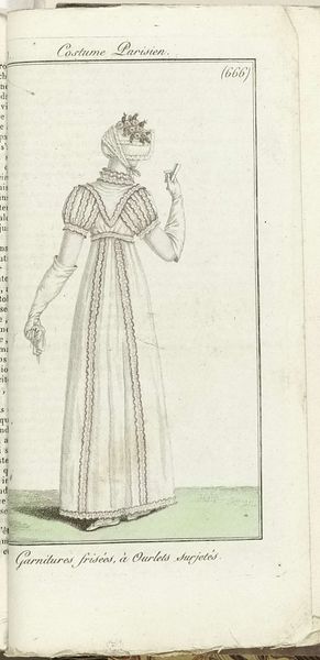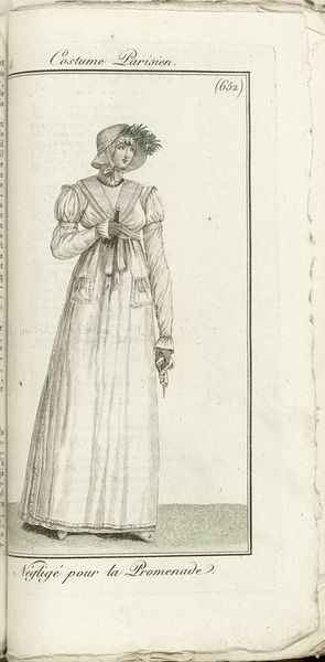 Horace Vernet created this print, titled “Grand Négligé,” around 1805 for the Journal des Dames et des Modes, offering a glimpse into Parisian fashion during a transformative era. As the journal circulated among the elite, it subtly reinforced the period’s strict social hierarchies. The "Grand Négligé," or 'large undress', was clothing to be worn in the semi-privacy of one's own home. It was a signifier of class and status. Here, the woman’s attire suggests both freedom and constraint, reflecting the complex role of women in post-revolutionary society. The delicate fabric and soft colors evoke a sense of femininity and refinement, while the overall design hints at the limitations placed on women's expression and mobility. Consider the cultural narratives perpetuated through fashion and how they shape perceptions of gender and identity. The artist captures a moment in time while inviting us to reflect on the ever-evolving dialogue between clothing, identity, and power.