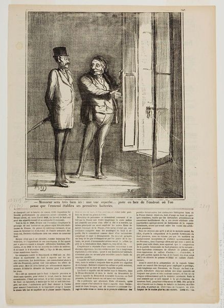 Editor: This lithograph by Honoré Daumier, "If you are not aristocratic, it is useless for me to show you this apartment that I rent only to titled persons," feels incredibly pointed. What’s the significance of this interaction between the porter and the potential renter? Curator: Daumier's work captures a very specific tension in 19th-century Paris, that enduring power of the aristocracy. Notice how the porter's gate becomes a symbolic barrier, a filter, reinforcing social hierarchies. What emotions do you think Daumier wanted to evoke in his audience? Editor: Discomfort, certainly. The porter's dismissive gaze and the woman's hopeful expression create a palpable sense of injustice. Curator: Exactly. Daumier uses these visual cues to criticize the persistence of class privilege. It's a timeless commentary on social exclusion. Editor: I see it now – the image really holds a mirror up to society, then and now. Curator: Indeed, and it invites us to reflect on what symbols of exclusion endure today.