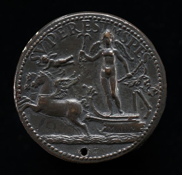Editor: This relief sculpture, "Blind Man with a Staff and Water-flask, Led by a Dog [reverse]," was created by Leone Leoni sometime between 1560 and 1561, crafted from metal. It seems rather unusual. What are we looking at here? Curator: It's more than just unusual; it's a commentary on the means of artistic production and its place within society. The materiality of the bronze, and the laborious process of casting and chasing, all speak to the value placed on skilled labor during the Renaissance. Look at the deliberate text bordering the image – this suggests it served a particular function, either commemorating an event or for circulation and exchange. How do you think its design and the production process affected its social impact? Editor: Well, considering it's a relief and not a fully realized sculpture, it seems like its goal was mass production. But for what end? Curator: Exactly! Think about the function of medals during the Renaissance. They weren’t just art objects; they were tools of power and propaganda. The act of making and distributing these images, produced with skilled, yet also arguably anonymous, labor, had real social consequences. Who was meant to receive this object and what ideas were circulated with it? How does this intersect with ideas of artistic genius or fame? Editor: So it's less about individual artistry and more about the impact of art within its cultural and economic systems? The material serves as a messenger itself, beyond the figures portrayed. Curator: Precisely! Considering art through the lens of materials, production, and its distribution opens new avenues for understanding its impact on shaping and reflecting social values and norms. It is important to ask: who profits and what social values are propagated by this object and its creation? Editor: This has certainly altered my view. I will now consider labor and production methods when experiencing art!
