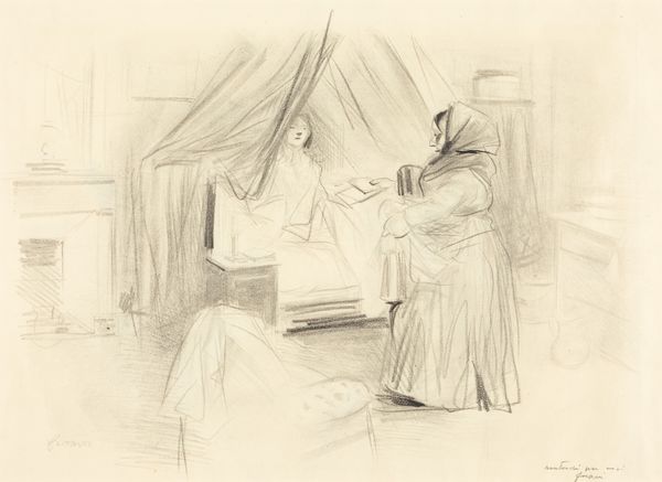 Henri de Toulouse-Lautrec created this lithograph of André Antoine and Fermin Gémier in "A Bankruptcy" using crayon and spatter. What immediately strikes one about this image is its deliberate incompleteness. The scene emerges tentatively from the paper, with sections fading into an almost ghostly presence. Notice how the stark contrast between the solid dark form on the left and the ethereal, barely-there figure on the right creates a compelling visual imbalance. This tension can be seen as a reflection of the play's themes, where the actors are caught in the precarious balance between visibility and erasure. The semiotic weight carried by each character is palpable: one cloaked in a shadow of failure, the other fading into the social backdrop. Consider the cultural codes embedded here, the representation of men, power, and visibility are all destabilized by the unfinished quality, challenging fixed interpretations.