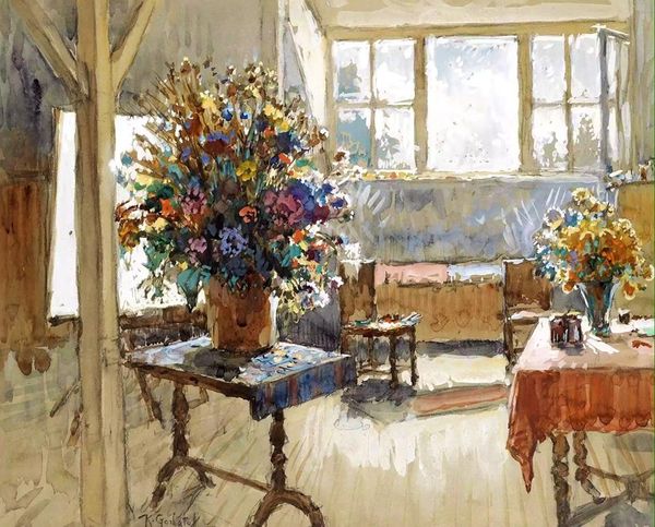 Konstantin Alexeevich Korovin made this painting, titled 'Black cat on a windowsill,' with oil paint, and from the looks of it, with quite some gusto! It is a scene of domestic bliss bathed in sunlight, and rendered through loose brushstrokes and high-keyed color. The way the light pours in, fragmented by those window panes, speaks volumes about Korovin’s process. Look at the surface quality: the paint is applied wet-on-wet, and pretty thickly in places. It's almost as if he's sculpting with color! There is a real physicality to his work, as if he wants you to feel the heft and resistance of each stroke. Check out the way he's painted the leaves of the trees outside the window, with such an economy of means, or the confident flick of the brush that defines the back of the cat! Korovin reminds me a bit of Édouard Vuillard, another artist who found poetry in the everyday, and was fascinated by light and the domestic interior. Both artists understand that painting is not just about representation, but about a process of looking, feeling, and making.