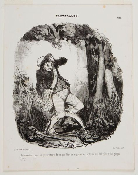 Editor: This print, "What's the difference between girls and pocket money?" by Paul Gavarni, presents two figures in a landscape. The material rendering gives it a somewhat satirical feel. What's your take on the means by which Gavarni produced this image, and how it relates to its message? Curator: The lithographic process is key. Gavarni's choice allowed for mass production, making social commentary accessible. Consider the labor involved, and how this accessibility democratized art consumption, challenging traditional hierarchies. Does this production method influence how we interpret the artwork’s message about social differences and economic realities? Editor: That’s a great point about accessibility shaping the message. I hadn't considered the lithography itself as a commentary. Thanks! Curator: Precisely. By understanding the process and materials, we gain a deeper insight into the social context and intentions of the artist.