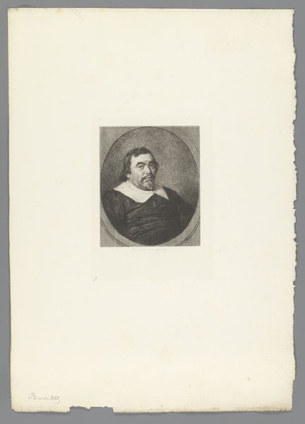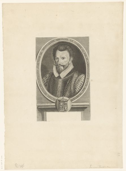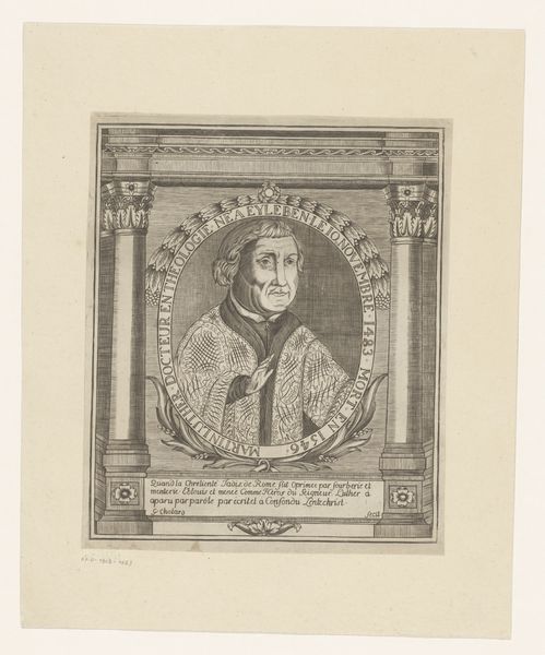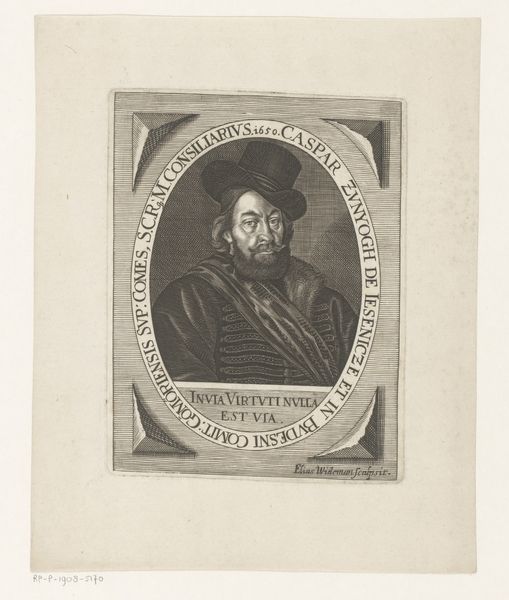 Curator: This portrait, etched in 1621 by Lucas Kilian, depicts Matthias Hoë von Hoënegg. What do you make of it? Editor: My first thought? Stern. Very official. And... airless, somehow. Like a specimen pinned under glass, yet, maybe I’m drawn to this intense feeling? Curator: Kilian was part of a printmaking dynasty; they really understood how to disseminate images of power and influence. Look at the framing, the Latin inscription circling Hoë’s portrait, lending authority and proclaiming his virtues. This wasn't just a likeness; it was a statement. Editor: Right. You see the mechanics, I guess. I'm more struck by the way light seems trapped *within* the face. It's an amazing, almost haunting contrast between his sharply etched features and the surrounding formality. It makes me consider, "Who was this man, behind this official look?" Curator: Matthias Hoë von Hoënegg was no ordinary man. A leading Lutheran theologian, advisor to princes, and a central figure in the religious and political landscape of the Holy Roman Empire, which also explains the care Kilian took in his portrait. Images held immense weight. Editor: Still, even knowing his stature, there’s a quiet unease emanating. I feel I’m getting an intriguing glimpse behind the propaganda, which adds another fascinating layer. Don't you think this is part of why we’re so drawn to old portraiture in the first place, trying to decode this sense? Curator: Precisely. We bring our modern eyes to an image intended for a completely different audience and time, resulting in these multilayered interactions that invite reflection, dialogue, and sometimes a little speculation. Editor: A reminder, too, that art isn't created in a vacuum. Political, social, and spiritual forces were at play in 1621. To truly "see" this artwork, we must at least glance at the era and its people. It shifts the whole reading... and deepens it.