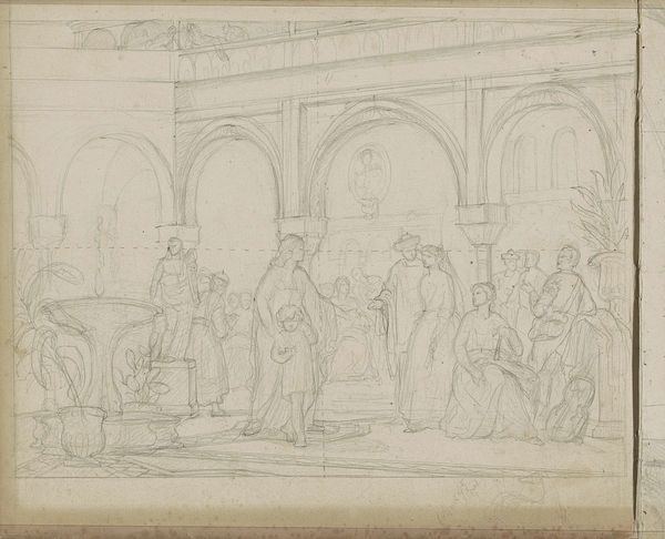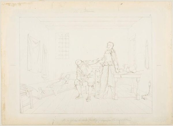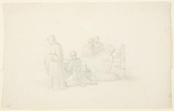 Curator: This is William Valentine Schevill's "Sketch of a Standing Man and a Seated Woman," currently residing at the Harvard Art Museums. Editor: There's a quiet tension, almost secretive, conveyed through those faint pencil lines. It feels like we are intruding on a private moment. Curator: Indeed, Schevill's sketch shows us a glimpse into what feels like a casual interior scene, rendered with a delicate touch that speaks to the intimacy of domestic life. The figures appear contained. Editor: And it's interesting, isn't it, how the grid behind them, presumably for scaling up the composition, is still visible? It reminds us of the labor of the artist, the process, the construction of a narrative. Curator: Precisely! Those visible construction lines offer a raw glimpse into Schevill’s methodology. The grid almost traps the individuals within it. Editor: In the end, it's this very incompleteness that makes this work so compelling for me—a study in captured moments. Curator: Agreed. It feels like a privileged peek behind the curtain of artistic creation, and the human drama in everyday life.