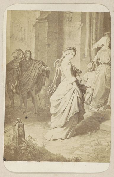 Editor: So, here we have a photo reproduction, likely of a print, dating back to somewhere between 1860 and 1890, based on a work by W. von Kaulbach titled "Clärchen (Egmont)." The material itself is a photograph. It definitely feels staged and intensely dramatic. The figures, their expressions... It almost looks like something catastrophic is about to unfold. What do you make of this scene? Curator: Catastrophic is a great way to describe it. This reproduction transports us back to the 19th century and invites us into the world of Romanticism, where emotional intensity reigns supreme. Can you see the expressions of despair on the faces of the crowd? Look at Clärchen – her body language, her raised arms! It feels like a desperate cry for freedom, perhaps a symbolic resistance to tyranny. But who are these people, and what tyranny are they up against, do you think? Editor: Right, they seem terrified! Perhaps the artwork's title holds a clue: Clärchen is the main character in Goethe's play "Egmont", and the play itself deals with a nation resisting the oppression of a foreign power. The picture then is showing an iconic moment from the play! But how does Kaulbach’s visual representation contribute to our understanding of the play's themes? Curator: A delicious question. Notice the sharp contrasts in light and shadow? It heightens the drama and almost lends a dreamlike quality to the image. Kaulbach doesn't simply illustrate a scene; he seems to be striving for the realm of myth. Through the dynamism of Romanticism, the artist distills feelings of anxiety, passion, and rebellion – these intense human experiences give life to the print and, even in reproduction, echo in the chambers of the modern heart. Editor: That's fascinating. So, it’s not just about depicting a historical scene, but about tapping into something timeless. Curator: Precisely. By the way, Goethe thought the ending to Egmont a total catastrophe! Maybe the artwork has caught the perfect moment to resonate with both perspectives, in reality *and* drama! Editor: So interesting. I came here with such a surface understanding of history paintings, but this connection really brings the period and artwork to life for me.