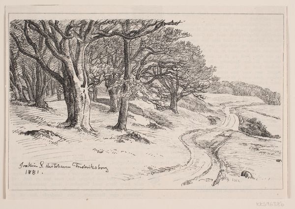 Editor: Here we have Johan Hildebrand’s "Gamle ege ved Eremitagesletten. Vinterdag," an etching from 1882. The starkness of the trees against the winter landscape is striking. I'm curious about the artist's choice of printmaking, etching specifically, for a subject so rooted in nature. What draws your attention in this piece? Curator: Well, immediately the material process leaps out. Etching allows for the creation of intricate lines, mimicking the bare branches and textures of the old oak trees. Think about the labor involved – the repetitive actions of marking the plate. The consumption of the landscape as image – who was buying and viewing such scenes? Editor: That makes me consider the kind of labor Hildebrand was trying to depict within the landscape itself, like perhaps he was suggesting land management or some other means of production. Curator: Exactly. Are we viewing nature untouched, or a managed resource? Consider the materials: metal plate, acid, paper, ink. All products of human industry, used to frame a ‘natural’ scene. Do the severe marks contrast or amplify the meaning of the print itself? Editor: It almost feels like he’s hinting at a human impact on nature. Maybe I'm overthinking this but all the horizontal lines are making me thing that something is artificial... Curator: Not at all. Naturalism and Realism as artistic movements were deeply intertwined with societal shifts – the rise of industry and urbanization. How did art function as a commodity, reflecting or resisting these changes? Does Hildebrand's work offer commentary? Editor: So it’s not just a pretty landscape. It reflects larger questions about how we interact with our environment and represent it through manufactured means. Thank you! Curator: Precisely. Material analysis reveals layers of meaning that might otherwise remain unseen.