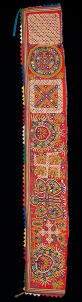 Curator: Let's consider this captivating object; a "Border for Head Covering" crafted around the mid-20th century, a woven cotton textile from the Kanbi people. Editor: It shimmers! The small embedded mirrors catch the light in a way that really activates the piece. It’s intensely decorative, and somehow quite joyful, even though it looks intensely laborious. Curator: The meticulous handwork is indeed significant. Think about the repetitive motions, the slow accumulation of pattern. This speaks to a community investment in the production and use of these head coverings, beyond mere functionality. What narratives are woven into this cloth, revealing gender roles and artistic expression? Editor: Precisely. Visually, I'm struck by the concentric circles, stars and the recurring cross motif, perhaps representative of cosmos or directional symbols; this might signal important social relationships, geographical orientation or a belief system. Curator: The cotton itself, consider where that material came from. Was it locally grown or acquired through trade? This weaving embodies the cultural interactions and economic realities of its time. The production process itself signifies so much. Editor: The colors themselves! Crimson, ochre, navy. Colors tell stories! These are emotionally resonant colors— what are they trying to express? What’s also fascinating is how abstract these shapes appear while remaining grounded in a symbolic function. Curator: The combination is crucial to understanding this "Border for Head Covering"; this art form challenges traditional notions of hierarchy because, here, functional craft expresses high-level creative intent. Editor: I agree, looking at this "Border for Head Covering," I keep wondering what the full head covering would have looked like and under what social circumstances it would have been worn. It’s a beautiful artifact hinting at hidden meanings. Curator: For me, looking at the artwork as a whole I’m now struck again with an even deeper appreciation of the textile worker and the significance of craft to that artist and its community. Editor: And for me, this intricate weaving, so meticulously made, is no longer an isolated textile, but a portal connecting us to generations past and the rich visual culture of the Kanbi people.