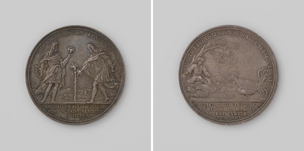 This silver medal, made by Sebastian Dadler, commemorates the Peace of Munster. The medal’s imagery is realized by die-striking, an established process in minting and metalwork that employs dies to compress metal, yielding a repeatable design. Here, the choice of material is significant. The preciousness of silver elevates the status of the represented subject, while its inherent malleability allows for the crisp impression of intricate details, from the lettering to the regal figures. The medal's design features Ferdinand III on horseback, and allegorical figures celebrating peace. These motifs aren't just artistic choices, but statements of power and celebration, crafted through skilled labor and precise tooling. The artistry lies not only in the design but also in the execution, where the properties of the metal are expertly manipulated to convey meaning. The act of making itself becomes integral to the artwork’s narrative, underscoring the importance of craft in communicating complex social and political messages.