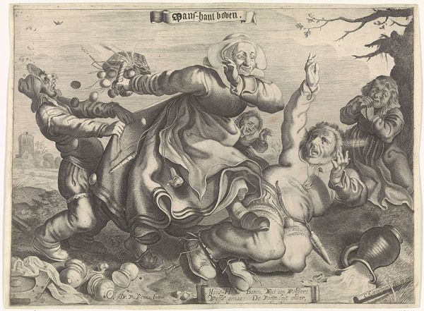 Curator: Well, what an enigmatic print! "Monsters, Monkeys, and Men," dating roughly from 1815 to 1825. Its anonymous creator has given us quite a lot to unpack. An engraving, from the looks of it, offering sharp contrast in the depiction. What are your initial thoughts? Editor: It strikes me as a visually unsettling, though meticulously crafted composition. The stark monochrome palette only heightens the feeling of unease. And that central figure seemingly fleeing... escaping what exactly? Curator: Perhaps reflecting the turbulent period after the Napoleonic Wars? There was widespread social and political upheaval at the time, certainly ripe for allegory. Think about the production of prints; they offered commentary across classes. Notice the figure who looks to be transforming a man into an animal; might that represent societal pressures deforming individuals? Editor: I see that clearly. And I’m immediately drawn to how this transformation underscores a rupture in conventional figure and ground relationships. It makes me consider a deconstruction of established order. Then my eye goes to the top center. I'm also fascinated by that winged creature, is it carrying some sort of canopied figure on its back? It's visually arresting. Curator: Yes! Think about the symbolism there, perhaps representing authority riding roughshod over the populace, or, more materially speaking, the printing press becoming a symbol of power that spreads information–sometimes malicious, propaganda. Also the figure in the balloon: consider how the technology of that time and access to that technology influences the figures of power and helplessness here. The use of printmaking made it available and cheaply distributed to the masses for them to find deeper and allegorical meaning in what was made. Editor: The linear precision of the etching creates clear hierarchies, a framework with these strange actors in it. Yet I wonder, without any documented reference, can any single interpretation contain it? Curator: Well, regardless, it invites questions. Consider also that these prints could be reproduced to convey particular meanings. This artist’s labor— the selection of images and themes for the print, its production, and its distribution—played an influential role in crafting collective identity during its historical and geographical moment. Editor: Precisely, even in its mystery the piece presents an impactful viewing experience. The contrasting light and shadow invite endless exploration of the artist's motives. Curator: It gives a real context to those monster motifs as representative of the anxieties, power struggles and technological advances of a swiftly changing world. Editor: Yes, the artist crafted something wonderfully intricate from this period.