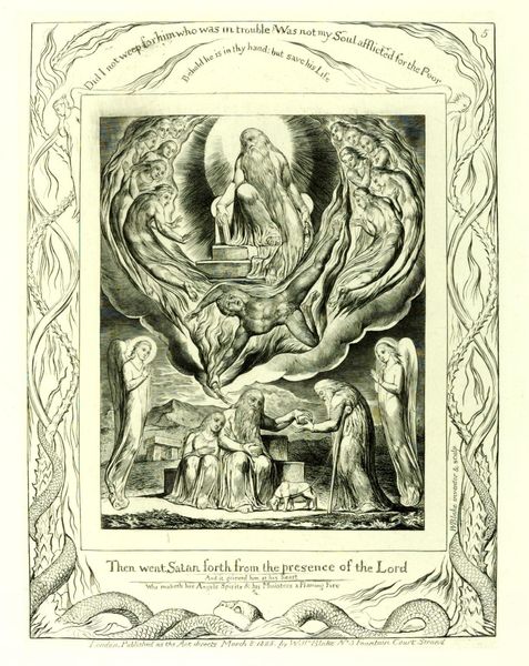 Curator: We’re looking at William Blake’s engraving, “The Lord Answering Job out of the Whirlwind,” currently held in the Tate Collections. Editor: My first thought? Sheer drama! It’s got this intense energy, like a cosmic gust of wind pushing everything around. Curator: Blake uses line work to create a dynamic composition. Notice the swirling vortex that frames the divine figure, contrasting with the static posture of Job. Editor: It feels like Blake is wrestling with something huge here – faith, doubt, the sublime… you can almost hear the words booming out of that whirlwind. It reminds me of staring up at a thunderstorm. Curator: The text integrated into the design emphasizes the artwork's narrative function, grounding the image in the biblical episode. Editor: For me, it transcends the literal story. It's about those moments when you're confronted with something bigger than yourself, something that just blows you away. Curator: Indeed, Blake's masterful use of form elevates the image beyond mere illustration. Editor: Exactly! This is one of those pieces that stays with you, spinning in your head long after you've seen it.