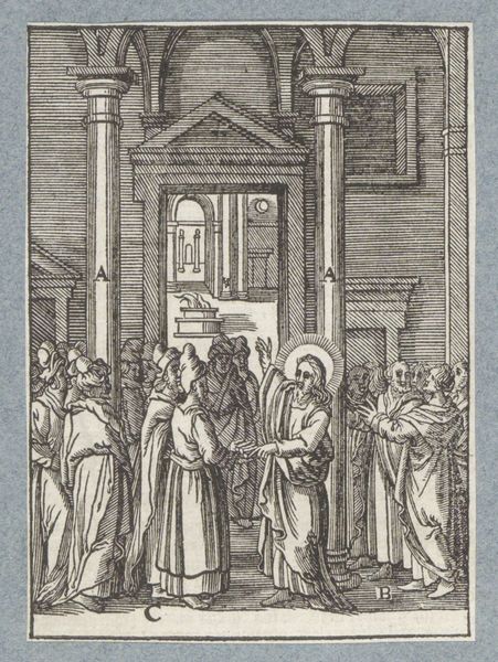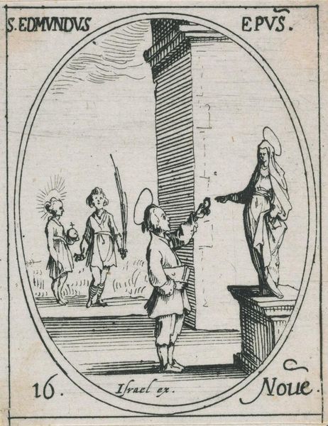 Curator: This is Jacques Callot’s "Saint Titus," a small engraving measuring just 7.6 by 4.9 centimeters, now residing at the Harvard Art Museums. Editor: Wow, even at that scale, it feels monumental. The graphic nature of the lines, the stark black and white—it’s got real presence. Almost theatrical. Curator: Callot was a master of etching and engraving, influencing many artists with his technical skill and dramatic compositions. Editor: The figures have such a unique expression, almost cartoonish—not in a bad way. Is that the Bishop giving a sermon? The people in the crowd are really captivated. Curator: Yes, the print likely served a devotional purpose. Saint Titus was an early Christian figure, a companion of Paul the Apostle. Callot's work often navigates the sacred and the profane, revealing much about the role of the church at the time. Editor: You know, it's easy to forget how much impact prints like these must have had. It's a bit like a sixteenth-century meme! Curator: Exactly! These works helped spread ideas. It gives us a peek into the ways people received and engaged with religion. Editor: It’s amazing how something so small can hold so much history, and even a little humor, honestly. Curator: It’s a reminder that art isn’t always about grand gestures. Even the smallest piece can illuminate a world.