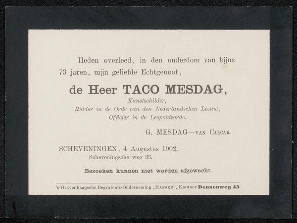 Curator: What strikes you first about this small, framed textile at the Rijksmuseum, an item titled “Overlijdensbericht aan Philip Zilcken,” thought to have been made between 1915 and 1917? Editor: An announcement, pure and simple, framed like a miniature portrait. It feels so formal, almost severe, yet intimate. Like a pressed flower between the pages of a favorite book. Melancholy. Curator: Indeed. This "Overlijdensbericht," or death announcement, is an artifact of social custom. Think about the historical context: It reveals how the passing of Hendrik Willem Mesdag was communicated to someone within his social circle, in this case, Philip Zilcken. It tells us a lot about status and ceremony, don't you think? Editor: Absolutely. "Commander in the Order of the Netherlands Lion," "Knight Grand Cross in the Order of Orange Nassau"...all those titles! But, the choice of typeface, the placement of text, all that contributes to a powerful impact. And is this typography woven, maybe on a Jacquard loom, more of an intricate portrait of bereavement than merely a piece of printed communication. The tangible weight of paper and thread amplifies a moment in time. Curator: Right. The format itself – a printed card mounted on textile – elevated it. It transformed the message into a keepsake, or perhaps, as we would interpret it today, even art. How the public and private spheres intermingled becomes interesting. Consider that this would have been a common form of public announcement, yet individually sent and received. Editor: A somber elegance. Like a whisper preserved. What do you make of the very deliberate formality, the titles all proudly mentioned. It reads like a life carefully lived according to duty. The choice to weave is also really fascinating, considering how textiles tend to have more longevity than, say, photographs. It makes it appear that a family wanted to communicate about the passing of an important person on long-lasting materials. Curator: In closing, looking at it today offers a glimpse into a world valuing legacy, formality, and social connections quite unlike ours, don't you agree? Editor: A poignant reminder of how we mark loss. The threads of time bind us all, even across centuries.