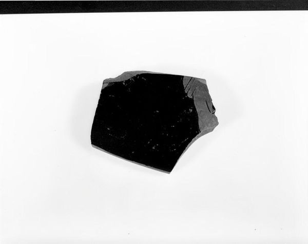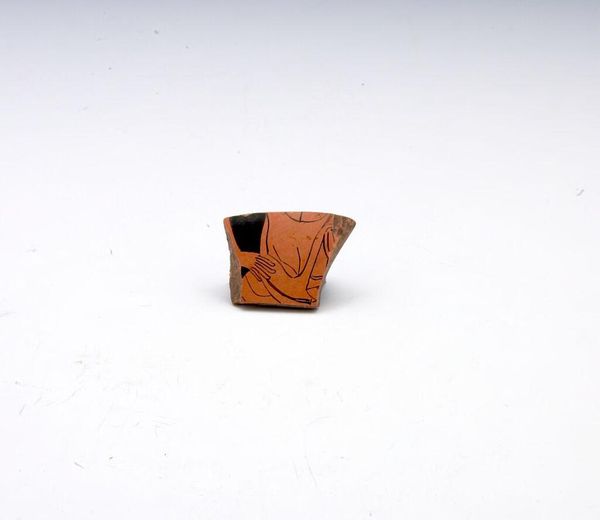 Curator: This pottery fragment, a red-figure cup fragment by Makron, is currently held at the Harvard Art Museums. It's a small piece, only about 4.4 cm. Editor: It feels ghostly, like a remnant of something larger, grander. The stark black figures against the pale ground create a strong contrast. Curator: Indeed, what remains shows a continuous maeander pattern and, quite possibly, the Cattle of Apollo. Think of the sun god's sacred herd, a potent image of divine possession and abundance. Editor: I see the geometric precision of the meander, but the fragmented cattle legs appear almost abstract, challenging any clear narrative reading. Curator: Perhaps, but consider how broken narratives can hold immense power. This fragment hints at a mythological whole, inviting us to reconstruct and remember. Editor: True, the incompleteness adds a layer of intrigue. It's a minimalist composition with maximal symbolic weight. Curator: Precisely. It makes you wonder about the stories these broken pieces still tell. Editor: Yes, this small fragment feels like it contains something of a vast memory.