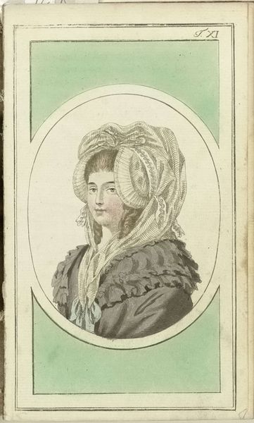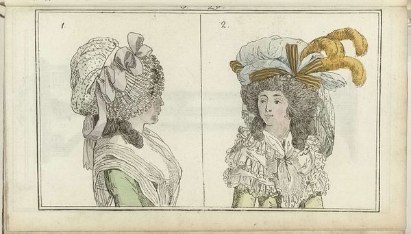 Curator: Oh, the feathers! My first impression? It's all just a glorious, over-the-top explosion of texture and powdered confidence. Editor: This etching is from an issue of "Journal des Luxus und der Moden" dating to 1786, a publication by Friedrich Justin Bertuch. It presents a stylish lady. The medium combines printmaking techniques with an early form of fashion journalism. Curator: Fashion journalism, how delicious! But you know, beneath the gorgeous excess, there's a definite, almost satirical sharpness to the line work. Editor: Absolutely. The fashion press of the period often served as a space to negotiate complex ideas about gender, class, and national identity. Consider, for instance, the extravagance on display, like that powdered wig… It spoke volumes about social hierarchy. Curator: Hierarchy certainly, but it’s also sheer, playful artistry! Just imagine the artistry—or perhaps absurdity—required to keep that towering confection in place all day! Editor: Well, extravagance wasn’t just visual; it was economic and political. These displays of wealth occurred against a backdrop of growing economic disparity in pre-Revolutionary France. Curator: Of course! Those societal tensions seethed beneath the surface, even within such images of frivolous opulence. The looming Revolution always makes appreciating images of the ancien regime so difficult. I wish there was some way to see it just at face value. Editor: I can see that, but considering historical circumstances often helps reveal underlying commentary, if not critique. These types of publications inadvertently show just how deeply material culture can embody societal struggles and power dynamics. It reflects history and its politics more broadly, wouldn't you agree? Curator: Yes. These fashion plates were definitely a coded language—and one that whispered about things far weightier than ribbon or lace. So much emotion bottled up under the lace and perfume. Editor: Ultimately, examining historical artwork involves navigating that space between aesthetics and analysis, engaging with what the art conveys on the surface, and understanding the deeper socio-political undercurrents that shaped it. It all works as a cultural history lesson. Curator: It's been enlightening to consider the many layers behind a seemingly light-hearted image!