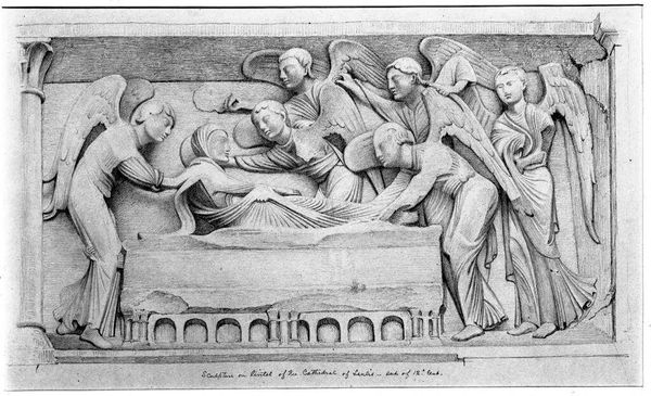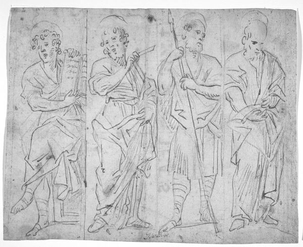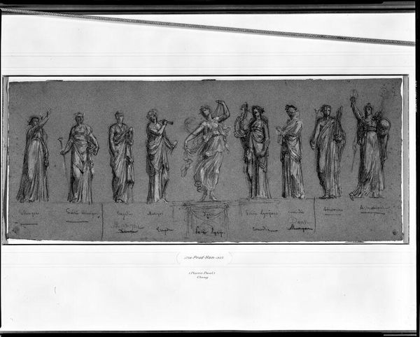 Editor: So, here we have Merry Joseph Blondel's "Virgil Reading the Aeneid to Augustus and Octavia as Livia Listens." It’s a drawing, fairly small, and feels like a classical frieze. What's your read on this scene? Curator: It feels like theater, doesn't it? Virgil, the star, holding court. But look closer—Livia lurks, observing. Is it admiration? Manipulation? Blondel invites us into the subtle drama of influence and power, doesn't he? Editor: That's a great point. I was so focused on the central figures, I almost missed her! There's a lot more going on than just a simple poetry reading, I think. Curator: Exactly! And isn't it fascinating how a simple drawing can evoke such complex layers of political and personal intrigue? It's like a whisper from the past, full of secrets.