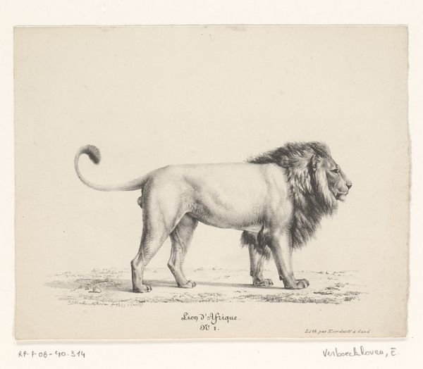 Editor: This drawing, called "Leeuw," by Eugène Verboeckhoven, likely made between 1825 and 1849, is rendered in graphite. There’s something immediately striking about the lion’s gaze, a kind of regal weariness. What do you make of it? Curator: The lion, an ancient symbol of royalty and power, is presented here in a rather subdued manner. Notice how Verboeckhoven captures its form with such meticulous detail, yet the gaze you mentioned hints at something beyond mere physical strength. Do you think it challenges our perception of the lion’s symbolic weight? Editor: I think it does. We expect the roaring king of beasts, but get something much more…contemplative? Curator: Precisely. It’s interesting to consider what this means in the context of the 19th century. Lions often represented colonial power and imperial ambition. By depicting this lion with a touch of melancholy, is Verboeckhoven perhaps hinting at the burden, or even the illusion, of such power? Editor: So it's more than just a portrait of an animal? It's almost a commentary on societal ideas around power and control, represented through this very iconic creature. Curator: Exactly. The enduring image of the lion carries so much cultural memory. Think of the Lion Gate of Mycenae or the lions on heraldic crests throughout Europe. Verboeckhoven uses that established imagery to provoke new considerations. Does it succeed, in your opinion? Editor: Definitely. I hadn’t thought about the history of lion imagery. Looking at this drawing now, I see not just an animal, but a symbol weighed down by its own significance. Curator: And perhaps the artist, by imbuing the lion with such psychological weight, invites us to reconsider the symbols we inherit and the stories they tell.