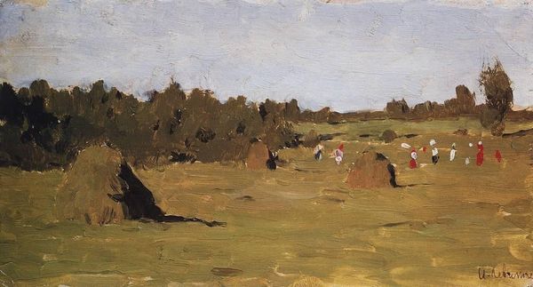 Editor: Berthe Morisot's "Landscape near Valenciennes," painted in 1875, feels surprisingly modern for its time, especially given it’s rendered in oil paint. I’m drawn to how the broad brushstrokes almost dissolve the landscape. What stands out to you in this piece? Curator: Immediately, I consider the materiality of the paint itself. Notice how Morisot isn't trying to disguise the application of the oil; it's frankly, on display. The texture, the thickness in some areas versus the thin washes elsewhere – these weren't accidental. It speaks to a rejection of the highly polished, illusionistic landscapes that were historically favored. How do you think this active revealing of the artistic process was received in the context of late 19th-century France? Editor: I imagine it ruffled some feathers. I suppose academic painting prioritized hiding the labor, whereas Morisot embraces it. It makes me think about artistic autonomy and perhaps the burgeoning role of women artists in shifting these accepted paradigms of labor. Curator: Precisely. Consider the social context too. “En plein air” painting was becoming increasingly popular, yes, but who had the resources, the leisure, and crucially, the *permission* to wander landscapes, setting up an easel? The very act of creating this painting became an assertion of a certain level of freedom and belonging for Morisot. It's not just a pretty scene, it's a document of a lived experience. Editor: So the landscape itself isn't simply a subject, but also a site of production loaded with social implications. Curator: Exactly. By analyzing her materials, process and social conditions, it makes her artwork all the more radical, right? Editor: It does, transforming a seemingly quiet landscape into something incredibly powerful! Curator: Indeed. Viewing artworks with different sets of lenses only heightens their complexities.
