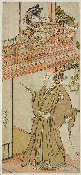 This is a memorial portrait of the actor Ichikawa Ebizo V, made in Japan, likely as a woodblock print. As a celebrated Kabuki actor, Ichikawa Ebizo V navigated a rigid social hierarchy where the arts were both revered and regarded with suspicion. In this print, we see the actor depicted with dignity. The memorial aspect suggests a reverence for his craft and persona. The inclusion of religious elements, however, indicates the complexities of identity; Ebizo was a figure of public entertainment, yet also a man facing mortality. The work doesn't just memorialize an individual. It also tells the story of the cultural tensions present in Edo period Japan. It reveals the status of performers in society, while hinting at the personal narratives behind the celebrated stage figure. The use of the memorial portrait suggests not only a personal loss, but also the loss of a cultural icon.