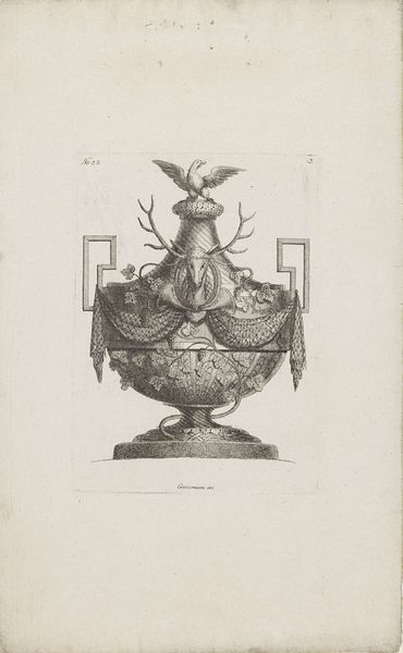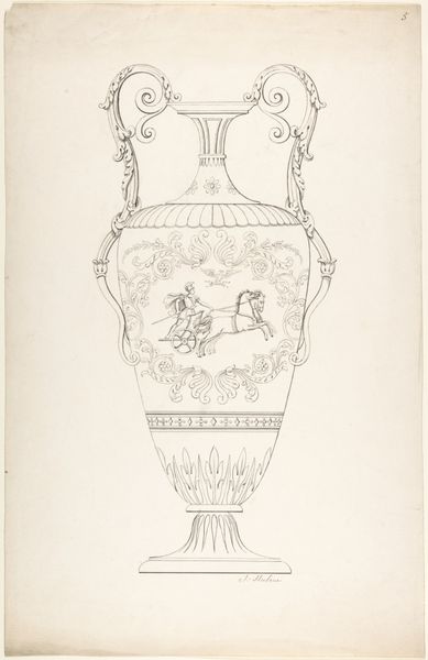 This is a graphite on paper sketch for an urn, made by an anonymous artist. At first glance, the design seems straightforward, but let’s consider the cultural context in which urns were often commissioned and displayed. Historically, urns frequently served as commemorative objects, meant to memorialize individuals, families, or even historical events. Given this context, we can consider what it means to create an urn for display. Who is being memorialized here? What values or narratives are being upheld? The delicate floral patterns and classical shape may evoke sentiments of reverence and nostalgia. But there's also a feeling of absence because of the anonymity of the artist which leaves us to grapple with broader societal themes of loss, memory, and the stories we choose to preserve. It becomes less about the individual and more about the collective human experience.
