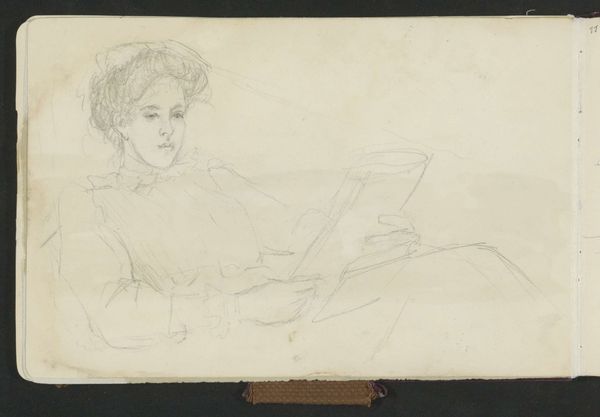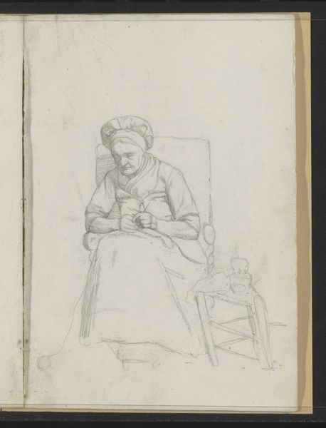 Curator: Let's turn our attention to this subtle, intimate sketch by Niels Larsen Stevns. Titled "Studie af en kvinde med sytøj, samt notat," it roughly translates to "Study of a woman with sewing, and notes," created sometime between 1906 and 1910. Editor: The first thing that strikes me is the quality of line. It’s a quick pencil sketch on paper, giving the image a kind of immediacy. The vulnerability in the subject's downward gaze is particularly poignant, made stark by its unfinished quality. Curator: Indeed. This piece resonates with the artistic current of Intimism, a turn-of-the-century movement that turned to portray the quiet dignity of daily life. The woman depicted isn't idealized; instead, we find her engaged in the simple act of sewing, which, in that era, held considerable cultural and domestic significance. Her activity has profound associations. Editor: Absolutely. Looking closer, you can almost feel the texture of the paper beneath the artist’s hand, sense the pressure of the pencil. Stevns captures not just the woman, but also the domestic labor of the early 20th century. The very nature of a "study" also speaks to a stage in production of a bigger finished idea and is inherently raw and honest. Curator: The pencil sketch invites us to reflect on the symbolism inherent in the everyday. The act of sewing can be viewed as a metaphor for creation, mending, and the essential labor often performed by women. Consider that dress as both a social uniform, perhaps, but also one requiring upkeep in times of precarity and hard labour. Editor: And the materials are so crucial to understanding this. Paper and pencil - accessible, readily available materials that allowed Stevns to quickly capture this moment. It underscores the idea that art can be born out of the mundane, elevating the commonplace. The fact that the paper has some notations on it is intriguing too, and brings us close to his way of working and materials as almost accidental or ephemeral. Curator: I agree. It leaves me with a sense of deep reflection, of witnessing a moment suspended in time, preserved with an artistic eye towards both symbol and the social position of the depicted woman. Editor: Yes, seeing art which portrays the intersection of material culture and social activity. Thank you, Niels Larsen Stevns, for giving this piece of working class material and labour another life.