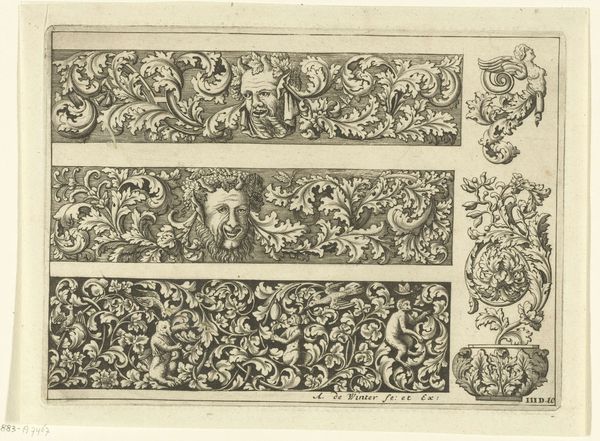 Editor: This is an intriguing pen and ink drawing titled "Drie friezen met bladranken," made around 1696 by an anonymous artist. It’s a set of three decorative friezes filled with leafy vines, almost like designs you'd see repeated on fabric or wallpaper. What strikes me most is the intricacy of the pen work – you can really see the labor involved in creating this. What do you see in this piece? Curator: I see a clear connection to the material conditions of art production in the late 17th century. These aren’t just abstract decorations; they’re examples of designs likely intended for larger-scale manufacturing, maybe wallpaper or even textiles, as you mentioned. Consider the labor invested. Someone meticulously crafted this, possibly to be replicated many times over. Do you see any evidence of the artist trying to optimize the design for easier reproduction? Editor: Well, the patterns do seem to repeat within each frieze, suggesting they could be easily extended. But how does the ‘craft’ aspect influence its status as art? Is it just a design sketch, or something more? Curator: That's a great question! It challenges our conventional art historical notions. Was the artist aiming for aesthetic value, or was the primary purpose practical, commercial? Either way, we shouldn't dismiss the technical skill, labor, and intention behind this piece. The “anonymous” tag is important here as well. Are we considering individual “artistic genius” or an artisan following accepted practices to create something functional and, ultimately, saleable? Editor: That’s interesting. I hadn't thought about how its potential use influenced its artistic merit or the role of the artist, thank you. Curator: Precisely! By exploring its materials, production, and purpose, we gain a richer understanding that transcends simple aesthetic appreciation.