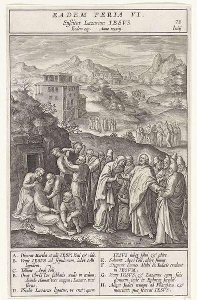 Editor: Cornelis Cort’s engraving, “Christ Appears to the Holy Women,” made around 1584, depicts a scene of revelation. What strikes me is the contrast: Christ is bathed in light, yet seems to gesture in sorrow or instruction towards a group of women overwhelmed with emotion. What do you see in this piece? Curator: This image speaks to a pivotal moment of transformation and recognition. Consider the symbolic language: the women clustered together, a united front of faith and sorrow. Note how their gestures—the clasped hands, the bowed heads—communicate grief but also an intense inner experience. Christ, his hand raised, bridges the divine and earthly realms. This moment isn’t just about seeing, but about *understanding*. What repeated visual motif or shape captures your eye and conveys meaning? Editor: I notice the repeated curving lines - in Christ's robe, in the women's veils, even in the landscape. Is that a conscious choice to unify the image, to connect the figures to one another? Curator: Precisely. Those lines create visual harmony, emphasizing the emotional ties binding them all together. The landscape itself—partially ruined, with hints of renewal— mirrors their own shattered faith gradually being rebuilt. How do you think viewers in the 16th century, saturated with religious iconography, would react to this depiction? Editor: I imagine they’d immediately grasp the biblical narrative, but perhaps also find personal resonance in the women’s grief and ultimate hope. It’s more than just a picture; it's a shared experience. Curator: Yes, Cort leverages a collective memory and shared symbolism. The power of images resides not only in what they depict but how they tap into the viewers’ existing beliefs and emotional landscapes. I hadn't considered how much the landscape mirrors a state of ruin, while simultaneously conveying themes of renewal. Thanks for pointing that out.