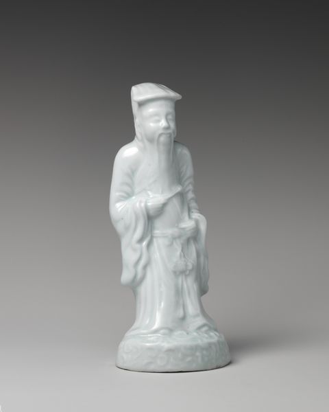 Here is a white salt-glazed stoneware, "Lady," created by Thomas Whieldon Factory in Staffordshire. The figure is rigidly composed, with the lines of the dress falling into vertical columns. The dog is also composed of columnar lines, and the two figures are connected by being placed on a square plinth. Consider the tension between surface and volume. The figure is a static, self-contained unit, despite the texture of the dress and the slightly asymmetrical placement of the hat. The piece employs the concept of structuralism, where underlying structures and patterns create meaning. The lady and dog represent societal roles, with the lady as the static, idealized figure and the dog as her loyal companion. The figure subverts traditional artistic values by simplifying into geometric shapes and resisting emotional expressiveness. The neutral color and unadorned surface emphasize the forms. This contrasts with the extravagance of the period, creating a work that challenges norms and invites ongoing interpretation.