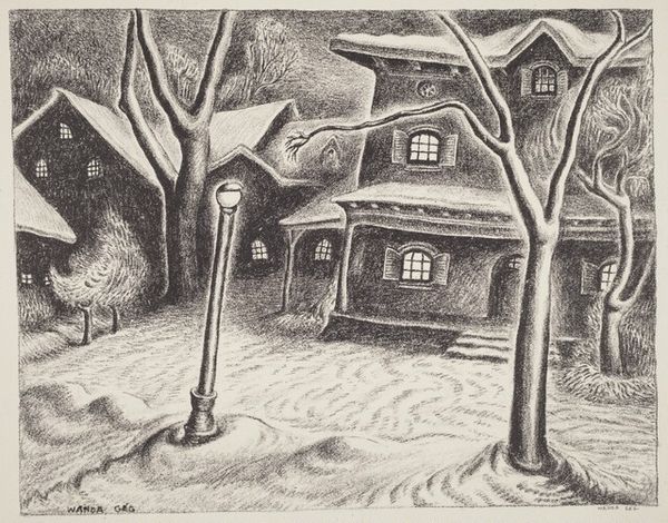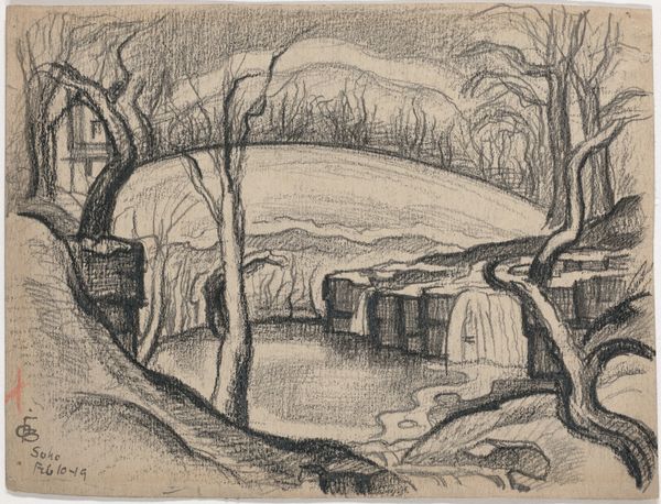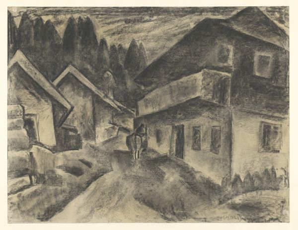 Editor: So, this drawing is "Landscape with woman and child in front of a house" by Leo Gestel, dating from around 1927-1929. The artist worked in charcoal, pencil and coloured pencil. I find its constrained palette creates a rather somber atmosphere. What catches your eye? Curator: Oh, Gestel… he's always got that evocative something, hasn't he? What I notice is this interesting tension between the monumentality of that dark house looming in the foreground and the tiny, almost swallowed figures of the mother and child. Doesn’t it make you think about shelter, about intimacy within the immensity of the landscape? I find that a good bit melancholic! Does this evoke any personal feelings for you? Editor: Definitely the contrast you pointed out strikes me too. It's like the house, or maybe even society itself, dwarfs these individual lives. It's thought provoking, because it is also somehow reassuring. Curator: Exactly. It's funny, isn’t it? How darkness, how Gestel's almost clumsy drawing style can be paradoxically comforting. I guess it's the human instinct, acknowledging vulnerability and strength, all rolled into one charcoal drawing. Gestel wants us to reflect with him. Editor: I see that. The imperfections in the drawing add to its sincerity, don't they? Curator: They absolutely do! Gestel embraced this truth of human touch. So what are your parting thoughts? Editor: It makes me consider how the simplest materials, like charcoal, can express incredibly complex feelings about ourselves and our place in the world. Curator: Beautifully said! It all brings it back home, so to speak. Maybe the intimacy is a bit easier than first presumed.