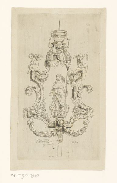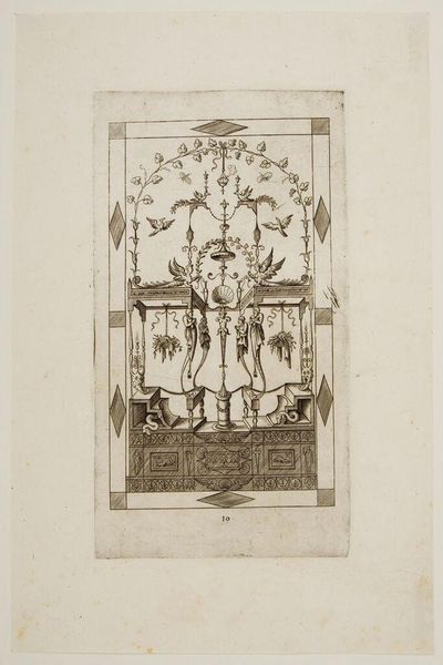 Curator: This etching, titled "Summer," is by François Boucher, a master of the Rococo. Its intricate lines and delicate composition immediately evoke a sense of refined elegance. Editor: It feels almost dreamlike, doesn't it? The way the figures are nestled within the foliage, like a secret rendezvous. There's a distinct air of leisure and perhaps even escapism. Curator: Boucher was deeply invested in portraying the social and political climate of his time. Consider how the figures' placement within the natural world mirrors the era’s complex relationship with aristocracy and labor. Editor: I'm drawn to the garland, that central wreath filled with portraits. Wreaths often carry connotations of victory, but here, it feels more commemorative, almost elegiac. What do you make of the birds? Curator: Birds can symbolize freedom, but also vulnerability. Their presence here raises questions about the figures' roles and the power dynamics at play within this seemingly idyllic scene. Editor: I see now that seemingly carefree moment is layered with social complexities. I am glad we could explore its depths.