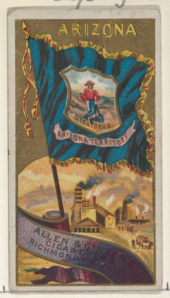 Curator: I'm immediately drawn to the stylized details, the limited palette working so effectively to evoke a particular sense of time and place. Editor: Indeed. What we’re looking at is one of Allen & Ginter’s cigarette cards from 1888, titled "Mississippi, from Flags of the States and Territories." The cards were small printed lithographs intended as collectible premiums. It’s a modest graphic art piece, rendered using colored pencils, offering an idealized vision of the state it depicts. Curator: "Idealized" is definitely the word. The flag is very prominently displayed, with that imposing eagle at its heart, overshadowing the scene below which seems to show both industrial activities, like extracting timber and agricultural labor picking what I believe to be cotton. Editor: It’s worth noting how that eagle, a clear symbol of American power and dominance, is juxtaposed with images of enslaved people working in cotton fields. These collectible cards often masked uncomfortable realities behind a veneer of patriotic imagery and economic progress. Curator: Exactly! The eagle bears a lineage tracing back to ancient Rome, embodying power and legitimacy. To see it hovering over laborers – likely former slaves in the post-Reconstruction South – sends a loaded message. Are they meant to be included or subservient in this American narrative? Editor: This imagery had real consequences. These cards circulated widely, shaping popular perceptions and reinforcing certain cultural narratives. The positioning of the workers below the flag promotes a subtle message of power, solidifying an established hierarchy. Curator: Even the banner at the bottom – emblazoned with “Allen & Ginter's Cigarettes Richmond, Virginia” – seems designed to normalize and promote these hierarchies within everyday life, commodifying labor under the guise of state pride. This almost becomes a metonym of capitalism! Editor: And don’t forget that it was made in Richmond, the former capital of the confederacy. That in itself brings extra baggage and suggests a possible allegiance that adds another layer to the scene depicted above. It asks us, who benefits from this depiction and whose story goes unheard. Curator: Precisely. It reveals how consumer culture participates in – or at least reflects – the power dynamics of the era. It leaves us with a complex picture of industrial America as well as lingering questions about progress, visibility, and value. Editor: Yes, and looking at this small object today lets us hold history in our hands in an unexpected and telling form.