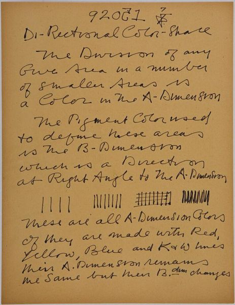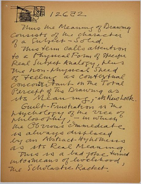 Curator: This is "Art Theory Text with Sketches" by Stuart Davis. It offers a glimpse into his thinking about artmaking. Editor: It feels like looking at someone's raw thoughts. The handwritten text has this immediate quality, almost like a stream of consciousness. Curator: Absolutely, and consider the materials: paper and ink. Davis's choice to jot down these ideas implies a directness, a lack of pretension. Editor: Right, no fancy canvas or oils here. Just a working document. And those little sketches—are they symbolic or just doodles? Curator: I think they are a visual complement to the ideas he's exploring in words. Symbols of the perceptual, maybe even the subconscious—a sort of shorthand for concepts. Editor: Fascinating how he marries language and simple form to wrestle with something as complex as perception and logic. It makes me reconsider the traditional hierarchy between theory and practice. Curator: Indeed. Seeing it as a material object, a site of labor, adds another layer to our understanding of Davis's artistic process and his intellectual pursuits. Editor: It's a really insightful reminder that ideas, just like paintings, are made, constructed, and come from somewhere concrete.