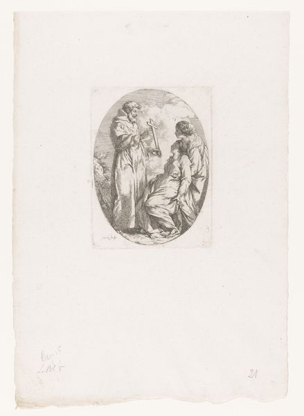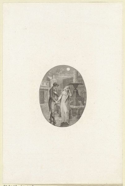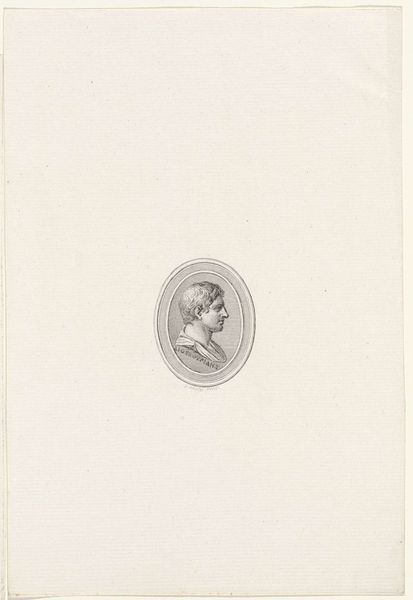 Editor: Here we have "Head of a Woman with Veil and Garland of Flowers," created around 1809 by Reinier Vinkeles. It’s a pencil and engraving drawing showcased at the Rijksmuseum. I am really intrigued by how delicate the lines are in the portrait, and how much empty space is around it. How would you interpret the piece? Curator: This seemingly simple portrait provides a window into the social and cultural ideals of the Romantic era. The woman, adorned with flowers and a veil, embodies a popular trope—an idealized version of femininity. But let's think critically: what role does this portrayal play within the larger political landscape of the time? Editor: That's interesting! I hadn't considered a political reading of it. Curator: These seemingly innocent images circulated widely, shaping public perception of beauty and virtue. Remember, the Napoleonic era significantly altered social structures across Europe, and art became a crucial tool for reinforcing or even challenging existing power dynamics. Does the oval frame suggest any connections with other artistic or political objects from that time period? Editor: Now that you mention it, the oval frame reminds me of cameo portraits, often used to depict royalty! Was this drawing meant to portray the sitter as someone of elevated status? Curator: Exactly. And what does it tell us that the artist used such subtle and fragile material? Could the medium used say something about the role of art and artists? Editor: The pencil and engraving could mean this portrait was reproducible, something that many could view... Thanks for pointing out that these depictions, seemingly straightforward, carry intricate messages reflecting societal power dynamics. Curator: Precisely. Reflecting on how this image participates in broader social and political discourse offers new meaning, as an artwork should.