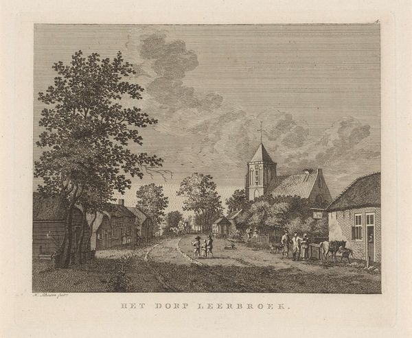 Curator: This engraving, entitled "Gezicht op Zonnemaire," or "View of Zonnemaire" dates to 1754 and is the work of Hendrik Spilman. It captures a serene cityscape in the Netherlands. Editor: My first thought is that it's a picture postcard from the past! The level of detail, even in monochrome, is remarkable; there's a sense of quiet contentment hanging in the air. It really does feel like I'm peering through time. Curator: That’s beautifully put. Look closely, and you'll notice how Spilman has deployed linear perspective to draw the eye deep into the village. Note also how the church steeple pierces the clouds – a symbol of divine presence grounding everyday life. Editor: Absolutely, and the steeple juxtaposes the huge cumulus nimbus – this could speak of temporal, cultural tensions with progress, new thoughts, and social shifts during this time in Dutch History. It’s more than just topography; it feels like Spilman is quietly revealing something about the psyche of the place. Curator: Indeed. Cityscapes during the Dutch Golden Age, when this engraving was created, served to both celebrate and document civic pride and identity. Each house, tree, and person contributes to the collective portrait of Zonnemaire. There is, undoubtedly, social commentary here. Editor: What’s compelling is the contrast between the manicured neatness on one side and the loose foliage that seems to soften the transition with its surroundings. A conscious choice that infuses both spontaneity and a grounding natural element to balance this sense of self importance you describe. It saves it, to me, from becoming cold or simply architectural. Curator: Precisely. Spilman understands how a built environment both reflects and shapes its inhabitants. The symbolism of a town’s layout can echo social structures and collective beliefs, too. Even seemingly simple design choices resonate over decades, carrying cultural memory. Editor: It's interesting to contemplate how, in centuries to come, our images—selfies, social media posts—will be viewed and analyzed. I suspect Spilman, like many artists, never fully knew the weight his work would eventually carry. Curator: A legacy, I believe, etched as much in the human spirit as in the lines of the plate. Editor: True. It’s a poignant reminder that art captures far more than just what we see.