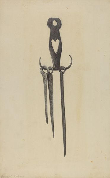Curator: Here we have Charles Cullen's "Skewers and Holder," a pencil drawing from around 1939. What are your initial thoughts? Editor: Well, immediately, I'm struck by the precision of the lines. It has an almost surgical, sterile quality. The starkness evokes a feeling of detachment, a focus on pure form and function. Curator: That's a great point. Considering the time period, 1939, it's intriguing that Cullen chose such a seemingly mundane subject. We have to wonder about the cultural significance of domestic objects, especially in the years leading up to and at the beginning of the Second World War. Was it a form of grounding, a focus on the immediate? Editor: Exactly. These are objects related to domesticity and, perhaps, scarcity. In the face of growing global uncertainty, the act of preserving, preparing, and rationing food takes on a new meaning. It becomes a form of resistance. What do you think? Curator: Absolutely, and the style – a very detailed realism. Perhaps this suggests an appreciation for the practical, a push back against the avant-garde art movements of the time. In contrast with the surrealism taking hold, it presents the functional. These skewers transcend mere utility; their very existence is testament to human necessity and ingenuity. It is an aesthetic celebration of work, labor, and survival. Editor: Right. I find myself thinking about the hidden labor embedded in this image. These skewers point to the unseen labor of women who likely used similar tools. In our contemporary moment, which tools and tasks are becoming invisible as technology takes over? It seems relevant. Curator: A powerful interpretation! The work speaks volumes about our own relationship to labor and consumption. It certainly makes you consider the quiet politics embedded in the everyday objects that shape our world. Editor: I agree. What seems ordinary can offer profound insights into social, economic, and gendered experience.