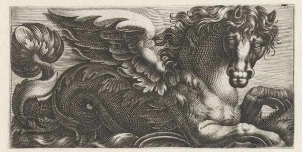 Giovanni Andrea Maglioli created this print, "Two sea creatures next to each other," using etching. It is a fantastical vision of hybridized animals that reflects the cultural fascination of the time with exploration and the natural world. The image depicts two creatures, part horse, part fish, and part mythical beast, rendered in exquisite detail. These beings challenge our understanding of identity, blurring the lines between animal, human, and imagined forms. It's hard not to wonder what these creatures represent. Are they symbols of transformation? Perhaps warnings about the unknown depths of the ocean? We see the intricate lines which bring these creatures to life, capturing their muscular forms and the texture of their scales. This etching invites us to consider the power of imagination, the fluidity of identity, and the complex relationship between humans and the natural world. It is both a testament to human creativity and a reflection on our place within the broader ecosystem.