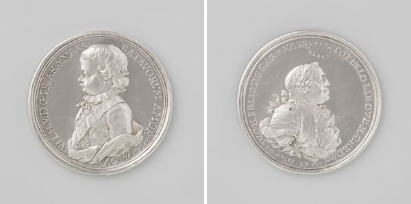 Editor: This is a fascinating engraved print of a metal relief depicting “The Marriage of Willem IV to Princess Anne of England in London,” created in 1734. It feels so formal and symbolic; I'm curious how we should interpret all these different visual elements. What do you see in this piece? Curator: Beyond just a commemorative piece, I see a powerful assertion of dynastic ambitions rendered within a specific socio-political landscape. The coin, acting as a form of propaganda, seeks to legitimize the union of Willem and Anne against a backdrop of complex power dynamics. Note how Neoclassical style evokes stability and order. Who does it serve, and at what cost? Editor: Propaganda… that's interesting! It makes me rethink the stoic profiles. Is that why the two figures, though conjoined, are presented so rigidly? Curator: Exactly! Their rigid composure is a visual language intended to communicate strength and purpose, strategically minimizing any emotional affect. The symbolism is carefully curated. We should also question the absence of any English iconography. Does the imagery solely promoting the Dutch lineage subtly challenge English sovereignty? Editor: So the symbols on the coin tell more than just a story; they’re political arguments! That hadn’t occurred to me, but it really deepens my understanding of the artwork’s message. Curator: Indeed. This is a conversation about power, influence, and the narratives we construct through art. It begs the question, how might contemporary artists reinterpret such events today, particularly from marginalized perspectives often erased from these dominant historical records? Editor: This makes me think about the silences in this artwork, who is absent, and whose story is not told here? Thanks!