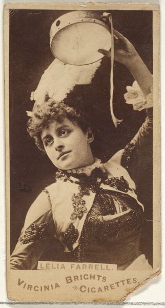 Curator: This is card 440, a portrait of Marion Elmore, dating between 1885 and 1891. It's part of the Actors and Actresses series, Type 7, produced by Allen & Ginter for Dixie Cigarettes. Editor: Oh, the sepia tones give it such a melancholic feel. There's a delicacy to her expression, almost a silent film star quality about her...a touch of longing in the eyes perhaps? Curator: The medium is fascinating. It combines drawing, print, and photography, all layered onto paper. These cards were essentially small-scale commercial artworks, distributed to promote tobacco products. Examining the materiality, one can trace the intersections of consumer culture, celebrity, and industrial print production. Editor: Yes, you see her reduced to a product, and yet her gaze transcends it all. Imagine, this little rectangle being tucked into a cigarette pack. The intimacy is peculiar; possessing a performer's image almost gives you ownership. I feel as though her quiet composure is resisting that exploitation, you know? Curator: It speaks to a whole system. Consider the paper production, the inks used, the labour involved in printing and distribution—the economic and social structures are woven into the very fabric of this object. Even the cigarette company's location in Richmond, Virginia—it brings a very palpable reminder of labour histories. Editor: Absolutely! It’s beautiful how she seems almost reluctant to meet the camera. Maybe she has a feeling she might turn into something consumed... I do wonder if she ever saw this card of herself? Did she feel empowered, exploited, indifferent? So many layers... Curator: Indeed, its value transcends simple representation; the object embodies a complex web of material processes and social relationships of that era. Editor: Exactly! She takes on even more than just what is depicted in front of you. What an elegant woman! It feels as though just observing is only scratching the surface.