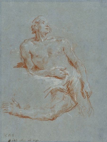 Curator: Immediately, the ruddy, sanguine strokes evoke warmth, even tenderness, in this portrait. Editor: Today, we're examining Guercino's "Seated Old Man with Right Arm Upraised," created in 1621 using charcoal on paper. It offers a fascinating window into Baroque era figure studies. Curator: I'm drawn to consider its subject. We see an elderly man, caught in a moment that reads as both resignation and subtle defiance. The upraised arm speaks to a sense of interrupted action, perhaps a gesture frozen by the artist's hand. Is he meant to symbolize age confronting power? Editor: You pinpoint well that duality, that precarious balance Guercino creates. But have you observed the strategic use of chiaroscuro? It's less about social allegory here, more about how the light models form, guiding our sight throughout, while the loose hatching captures movement. The formal dialogue is quite sophisticated for a quick sketch. Curator: Yet, his aged, perhaps wearied physique also invites a reading of societal displacement—of being rendered invisible by the march of time. Remember the position of artists within patronage networks then; the act of depicting the overlooked carried subtle rebellious charge. It echoes representations of marginal figures that permeated later socialist realist art, challenging dominant narratives. Editor: I recognize your point; but might it not simply be a preparatory study? I argue the expressive qualities and virtuoso execution alone secure its artistic merit. Surely not all art must perform such didactic roles to claim significance. Curator: That's the art-historical tightrope walk, isn't it? While isolating aesthetics offers analytical control, ignoring the rich potential for sociocultural interpretations often misses the deeper resonations art holds for viewers and within society. The interplay creates a valuable dialectic—it asks to reconsider those binaries and expectations. Editor: True; the power ultimately lies in holding the work open for precisely these contesting analyses, isn’t it? Curator: Precisely. We uncover our assumptions, layer our experience and let each drawing show, or at least imply, a different perspective, making these historical artifacts continuously current.
