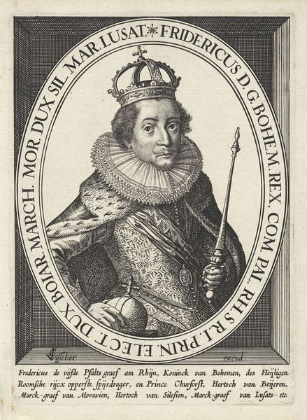 Curator: Here we have Simon van de Passe’s “Portrait of Charles I,” made after 1612. It's an engraving. Looking at it, what comes to mind for you? Editor: Melancholy. Something about the starkness of the line work, that intense gaze. There's a weight here, especially considering it was done when he was still quite young, before all the... unfortunate events. Curator: Indeed. The material, engraving, allowed for relatively widespread dissemination of the royal image. These prints served as potent tools for shaping public perception of the monarchy, projecting authority and… legitimacy. Think about the labor involved: the engraver meticulously transferring the likeness to a metal plate. Editor: It's fascinating to think about the layers of reproduction—the original painting (of which this is a copy) which no doubt involved the sitter and painter’s self-fashioning and promotion; the work of the engraver, then the distribution to a much wider audience via the print. Also, to create this image, the metal plate was crucial, it would have been so difficult. It looks like very hard work. Curator: Exactly, and consider the inscriptions, that elaborate oval cartouche in Latin around the figure. Each word, each title, "Prince of Wales," "Duke of Cornwall," adding to the projection of power, and future kingship, don’t forget. Van de Passe wasn’t just making a likeness; he was participating in a grand, carefully orchestrated PR campaign, in a sense. Editor: PR that met with… well, mixed results! Seeing this now, knowing how it all ended, there’s an undeniable irony, a sense of foreshadowing perhaps. The crisp, almost cold lines seem to amplify the sense of doomed grandeur. It is also kind of cold: not very personal at all. Curator: But perhaps that chilliness was part of the point, distancing the monarchy from the messy realities of everyday life, creating a figure of reverence and… fear, I’m sorry, respect! It really makes one wonder about the power dynamics inherent in the image-making of the time. What price visibility? Editor: It really shows a different dimension to how art reflects history beyond just pretty portraits, looking into power, propaganda and, indeed, doomed grandeur. Thanks. Curator: Agreed. The story is really there embedded in the material of its production.