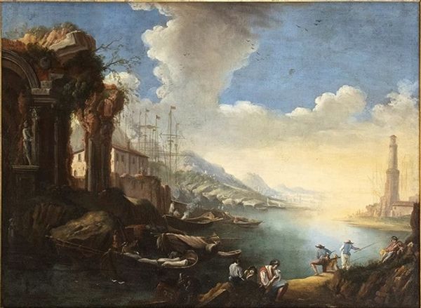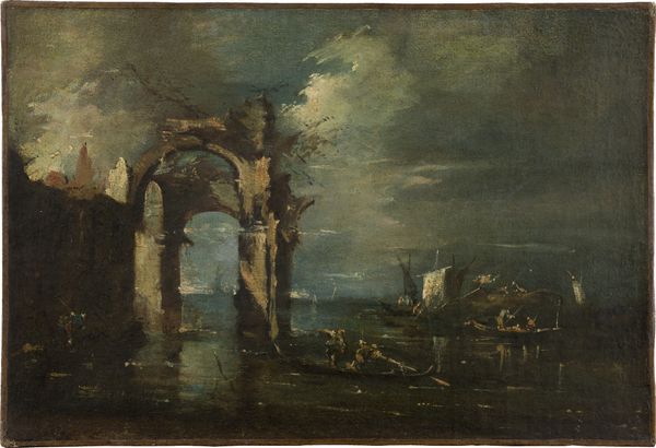 Francesco Guardi's "Fantastic Landscape," painted in the 18th century, immerses us in a world where reality and imagination blend. The canvas is dominated by soft, diffused light and airy brushstrokes that lend the scene a dreamlike quality. Notice how Guardi uses delicate blues and greys to create a vast, open sky, contrasting with the earthier tones of the architectural ruins below. Guardi masterfully manipulates perspective and scale, inviting us to ponder how such elements engage with our perception. The crumbling structures and distant figures evoke a sense of transience, whilst also hinting at the sublime. The semiotic interplay between decay and nature suggests a dialogue about time, memory, and the ever-changing human relationship with the environment. The painting’s formal structure, particularly its emphasis on atmospheric effects and fragmented forms, destabilizes traditional landscape conventions. It reflects a broader artistic and philosophical shift towards valuing subjective experience. "Fantastic Landscape" is not simply a depiction of a place, but an invitation to reflect on the layers of history, perception, and artistic invention.