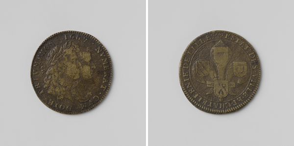 Curator: This is a bronze medal created in 1677 by the Monogrammist N, whose identity remains a mystery. The medal commemorates the burning of the Dutch fleet near Tobago during that era. Editor: It has such an archaic feel, like a fragment recovered from a long-lost civilization, and in this instance, the visual iconography exudes power and conquest. Curator: Indeed. The piece is double-sided. One side features a portrait of Louis XIV, King of France, identifiable by the surrounding inscription, "Ludovicus Magnus Rex." The flip side depicts an allegorical figure atop what appears to be a ship's prow, with the words "Ingeysa Batavorum Classe" surrounding it. Editor: That allegorical figure seems to be celebrating some form of triumph. Note the laurel in her right hand – it has always symbolized victory and acclaim throughout history. The winged figure resembles Pheme, the personification of fame and renown; such imagery could have cemented Louis XIV’s legacy. But, from a post-colonial perspective, the heroic portrayal can appear unsettling because we recognize the ravages of the historical context that underpins this memorial. Curator: It certainly encourages layers of reading. Consider bronze as a material, used since antiquity, in opposition to what this artwork documents— the swift destruction of a fleet. Is there some irony here? Metal to remember fire? How might that affect the cultural memory associated with this moment? Editor: Exactly! Moreover, understanding the rivalry between France and the Dutch Republic within broader power struggles requires understanding how Louis XIV, often presented as an absolute ruler, instrumentalized art. So this object, besides attesting to events in Tobago, speaks to that. Its value goes beyond historical accuracy: it is intertwined with identity, power dynamics, and propaganda. Curator: This work can operate like a symbolic key. While seemingly a simple object celebrating military might, it unravels entire discourses and reveals how power has been historically projected and commemorated. Editor: The medal’s size almost works against the grand scale of the events that are documented. I now view the work, on a smaller scale, as symbolic of propaganda itself and the way cultural memory can be reshaped.