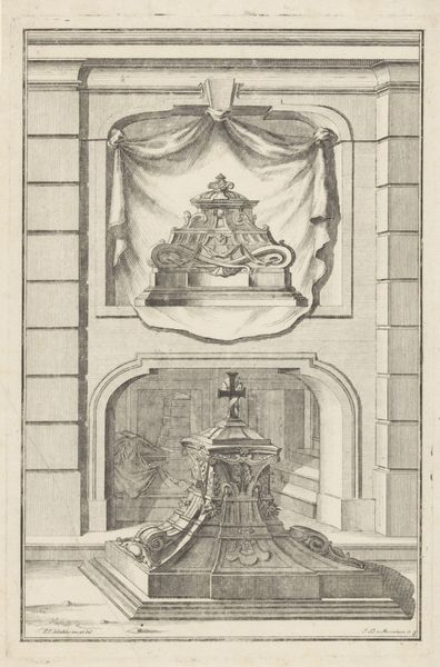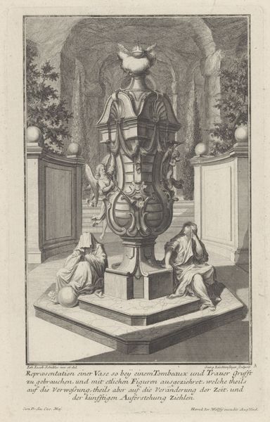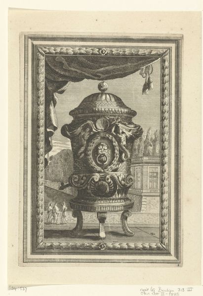 Curator: Welcome. I’m excited to discuss this engraving titled "Tuinhuis en fonteinen" created after 1724. It’s the work of Johann Matthias Steudlin. Editor: It's immediately striking. A landscape scene dominates, but there’s also this strange almost theatrical element—like we’re peeking at a stage set of water features, bathed in baroque idealism. There's something unsettling about it, as if the controlled nature is fighting against a darker, perhaps chaotic background. Curator: Yes, that controlled artifice is central to understanding these images. Water, of course, has profound symbolic weight across many cultures—life, purification, even the subconscious. Fountains elevate this element, bringing movement, sound and even a sense of magic through engineering and artifice. Waterfalls become liquid architecture. In garden design, as this image highlights, the iconography blends with social aspiration. It is not mere beautification but also demonstrates power and dominion over nature itself. Editor: I agree it highlights a complex relationship between humans and nature. It's easy to view these gardens as just a retreat for the wealthy, but what does it mean to confine natural forces into ordered, symmetrical displays while outside, in broader society, there may be other forms of confinement, be they class-based or even racially motivated exclusions from those very spaces? This print doesn’t address these tensions head-on but by choosing such imagery, we can perhaps start to interrogate the very structures it reflects. Curator: A valid and necessary point to raise. Steudlin, whether consciously or not, participates in this dynamic by preserving this particular vision. The very act of making it a print extends its influence beyond those physically present. It’s memory and aspiration formalized and circulated. A powerful image in its design and execution but not always in its ideology, perhaps? Editor: Exactly. Understanding how artworks function within the wider historical power structures and inequalities that shaped them, can allow us to better examine both present day social realities, and the complex layers embedded within our history. I think the print highlights that there were always multiple stories happening.